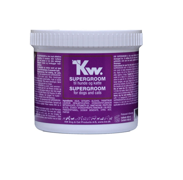 Vi har fundet Kw Super Groom Gr fra Kw hos Alttilhundogkat.dk i kategorien Hund Pelspleje Shampoo Balsam Shampoo Balsam. Den mest effektive oliebehandling til hundens eller kattens tørre eller ødelagte pelse. Giver smuk og blank pels uden at fedte, blødgør huden og forebygger hudproblemer. Super Groom er antisttisk og vaskes nemt ud igen.